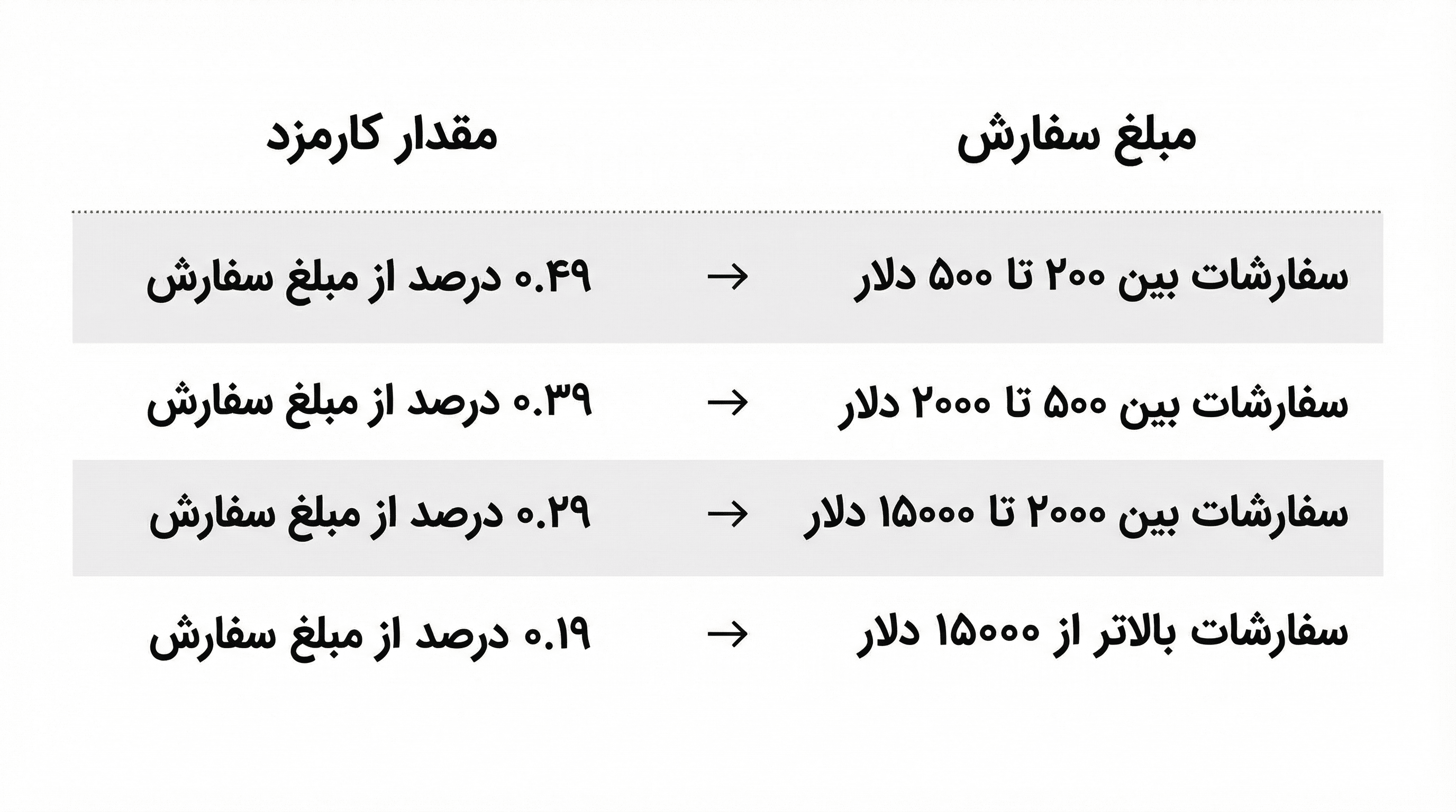 ۲- کارمزد سفارشات کمتر از ۲۰۰ دلار به صورت ثابت مقدار ۰.۸۹ دلار خواهد بود